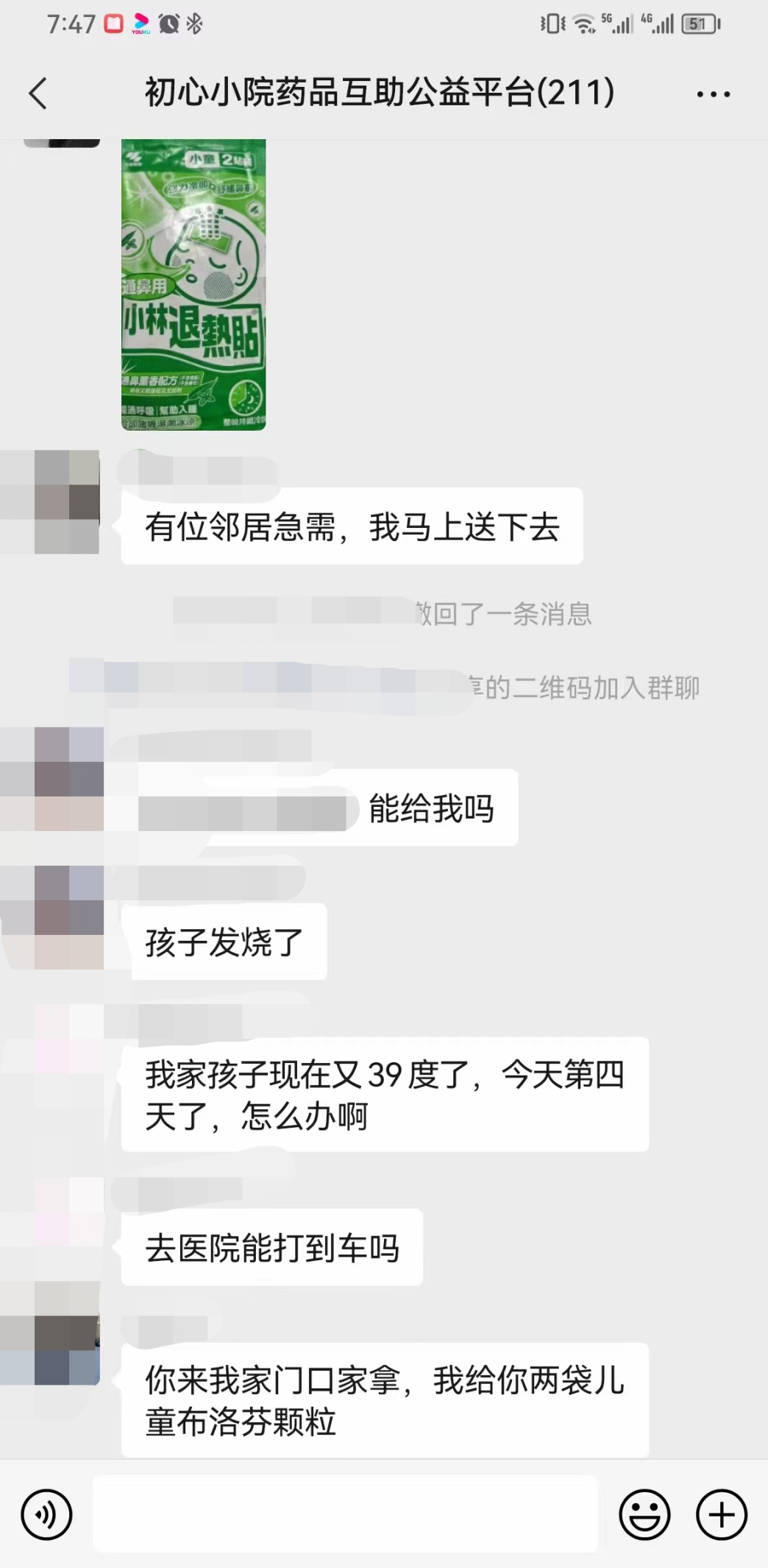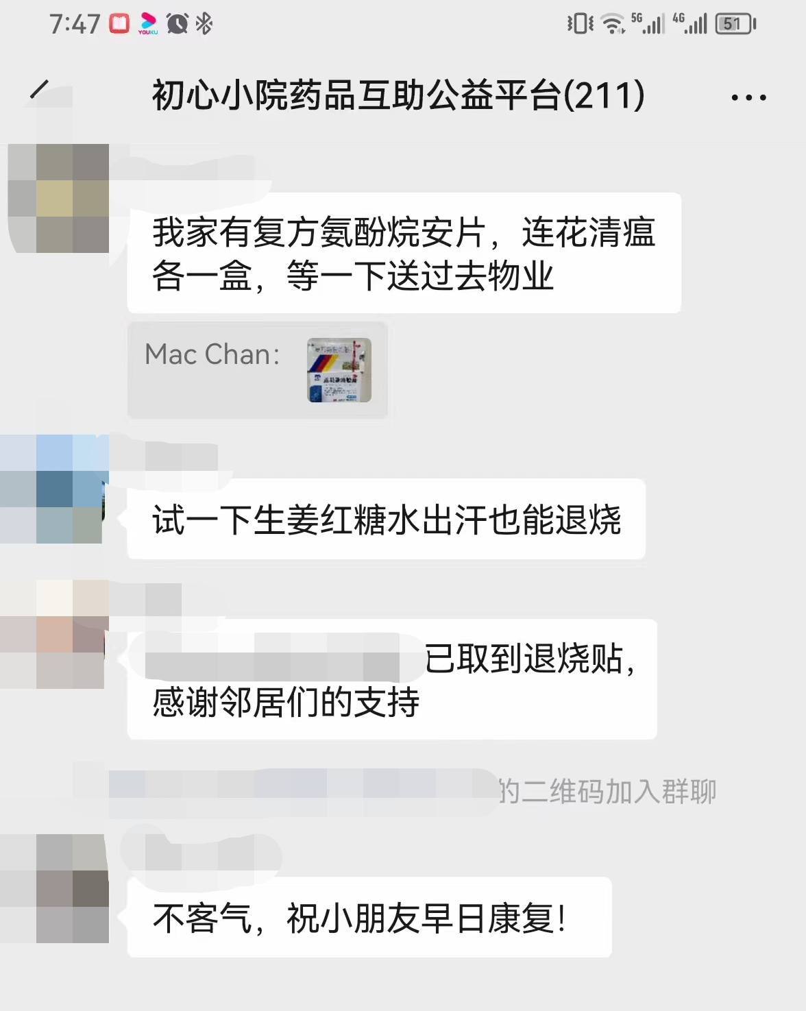 “孩子发烧了,现在去医院能打到车吗?”“孩子高烧吃了美林,一小时后头痛欲裂,该怎么办?”在互助群中,小区党支部不仅安排专人负责收集和回应居民诉求,重点关注老弱病残幼孕等重点群体,还邀请社康医生指导居民用药,从而保障用药安全,除此之外,也邀请了附近3家药店工作人员进群,方便居民第一时间得知药品到货信息。其中,一家药品老板受到小区互助精神的感染,也加入到爱心行动中,表示“如果大家急缺成人退烧药,可以去店里免费领取6粒布洛芬”。