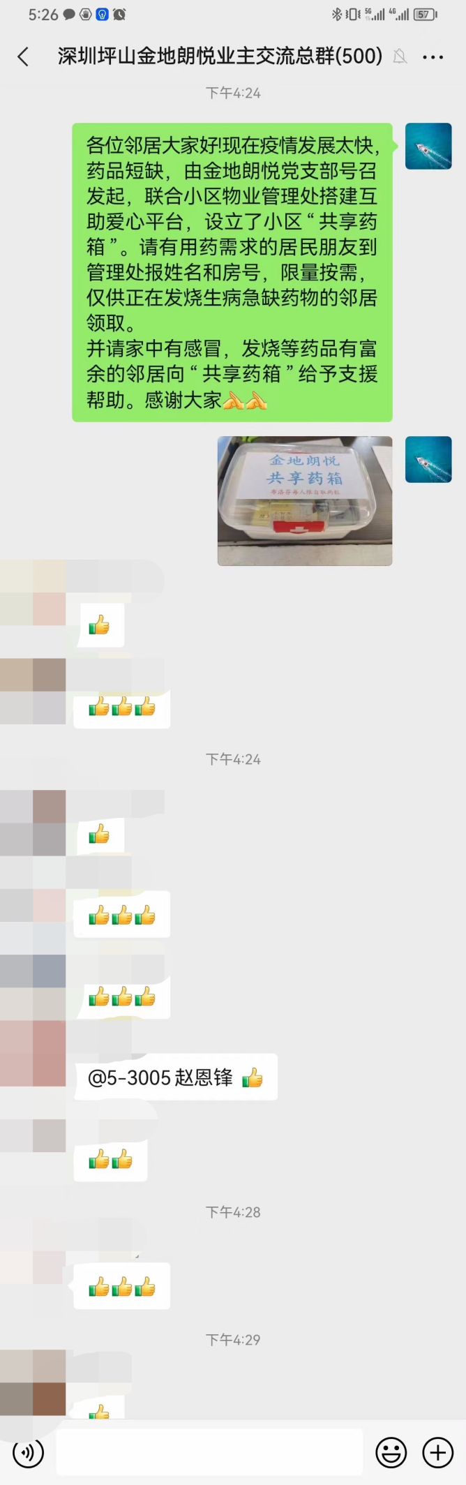 面对小区群里的求助信息,街坊邻居纷纷慷慨解囊,将药品通过“共享药箱”快速精准送达给急需的居民。这样一幅邻里和睦、团结互助的场景,正在深圳市坪山区不断暖心上演。