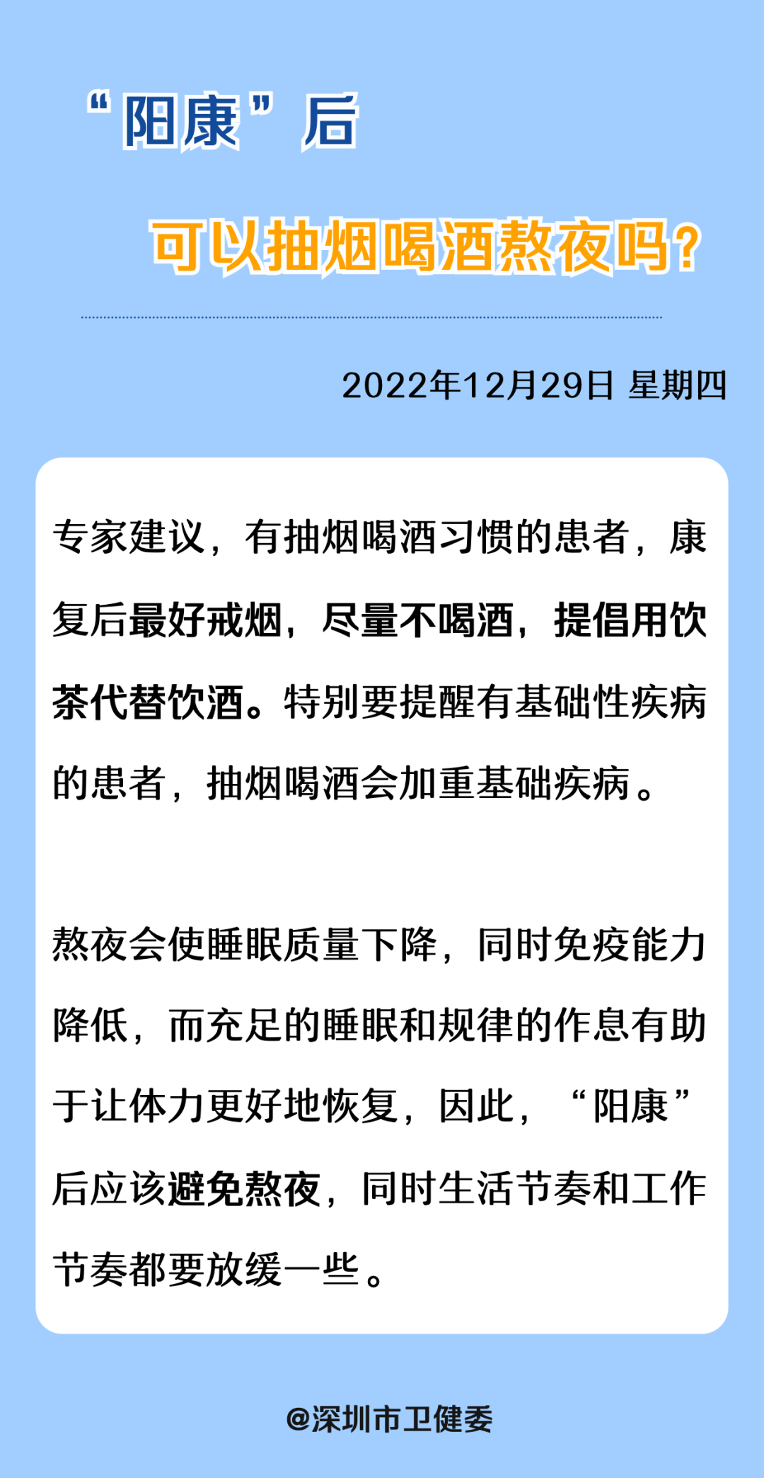 熬夜会使睡眠质量下降,同时免疫能力降低,而充足的睡眠和规律的作息有助于让体力更好地恢复,因此,“阳康”后应该避免熬夜,同时生活节奏和工作节奏都要放缓一些。