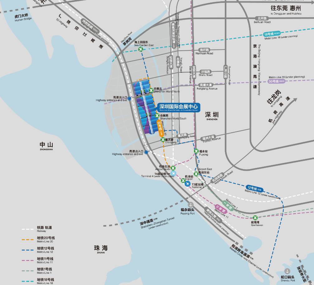 深圳国际会展中心地处粤港澳大湾区湾顶,位于深圳市宝安区福海街道展城路1号。紧邻深圳宝安国际机场,毗邻福永码头,紧挨广深沿江高速,接驳城轨,通过以下多种交通方式都能轻松便捷抵达展馆。