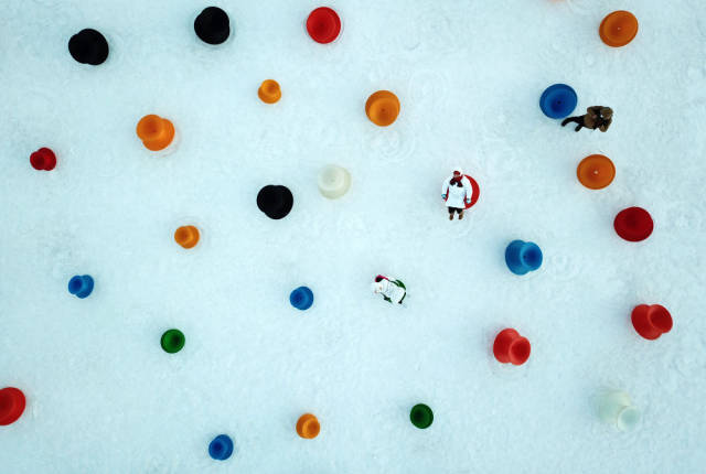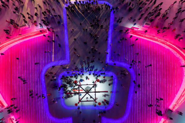 ↑1月24日,游客在哈尔滨太阳岛雪博会园区内体验冰雪娱乐项目(无人机照片)。新华社记者 王建威 摄