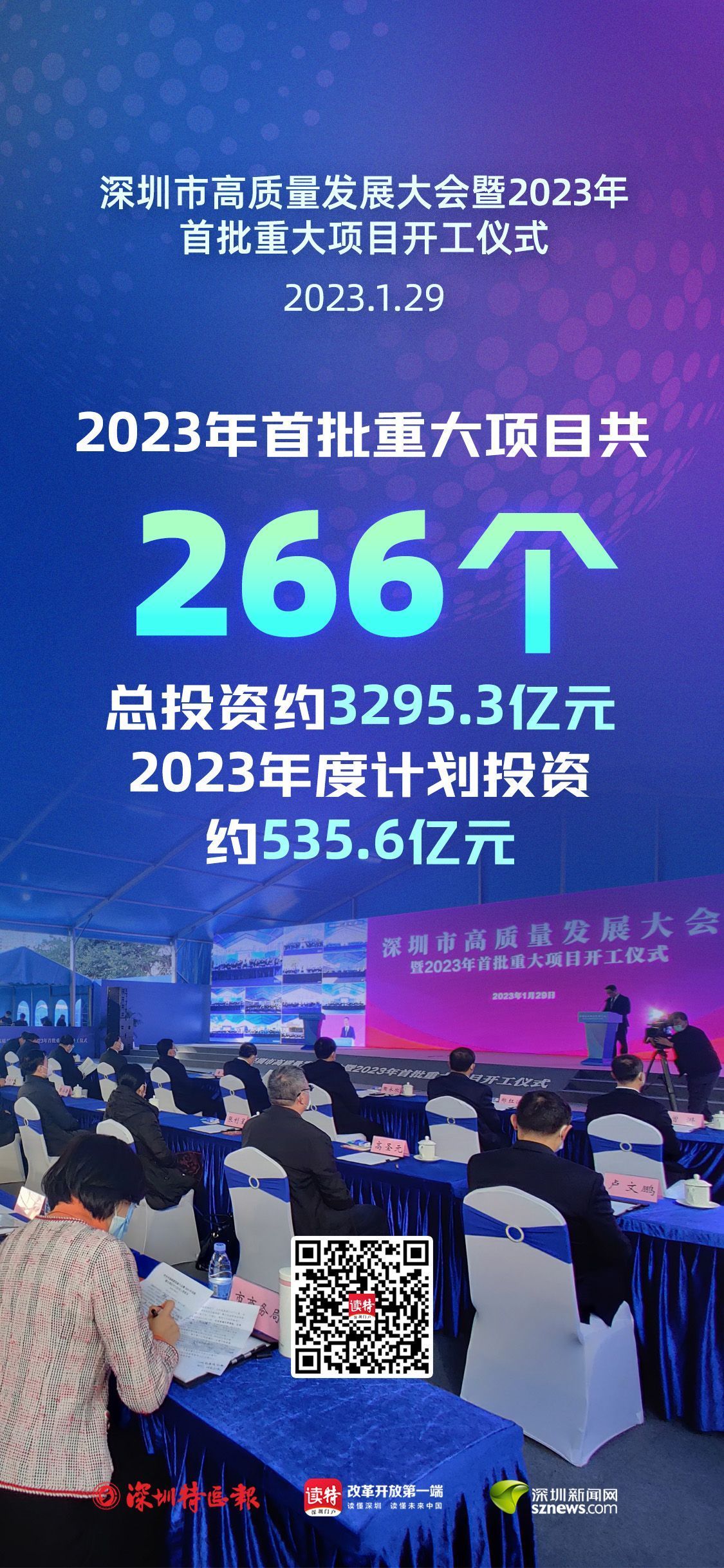 有谋划更有行动。昨天同时开工的2023年首批266个重大项目就是深圳抓高质量发展的开年起笔,266个项目总投资约 3295.3亿元,2023年度计划投资约535.6亿元。
