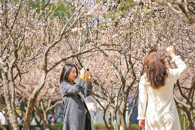 成片开放的梅花,让人仿佛置身粉红花海,市民用手机记录下美丽瞬间。