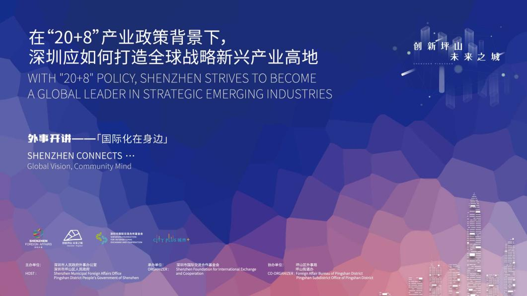 为落实《深圳市人民政府关于发展壮大战略性新兴产业集群和培育发展未来产业的意见》及配套文件精神,2月28日上午,由深圳市人民政府外事办公室、深圳市坪山区人民政府共同主办,深圳市国际交流合作基金会承办,坪山区外事局、坪山街道办协办的“外事开讲-国际化在身边”系列活动第三期:“在‘20+8’产业政策背景下,深圳应如何打造全球战略新兴产业高地”在坪山文化聚落会议中心成功举办。市委外办主任曹赛先,区领导冷和明、市相关部门领导、区相关部门负责人、企业代表、媒体代表参加活动。