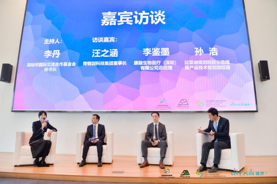 在嘉宾访谈环节,深圳青铜剑科技集团董事长汪之涵、康膝生物医疗(深圳)有限公司总经理李鉴墨、比亚迪规划院院长助理兼产品技术规划部经理孙浩三位嘉宾,围绕制造业应如何抓住国际合作机遇,探索管理创新,加快人才引进,更好激发企业产能分享经验与体会,并与现场参会嘉宾互动交流。
