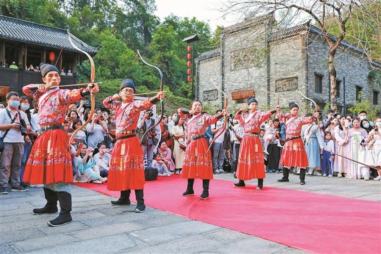 ▲国风舞台表演展示古代射箭技术。