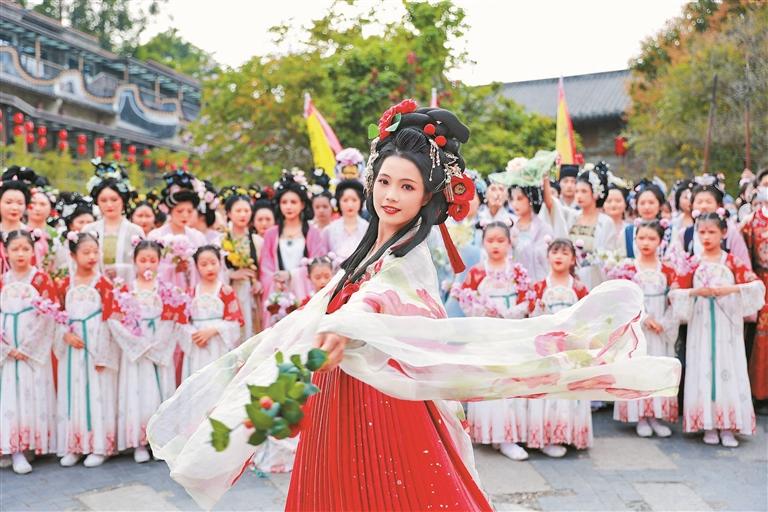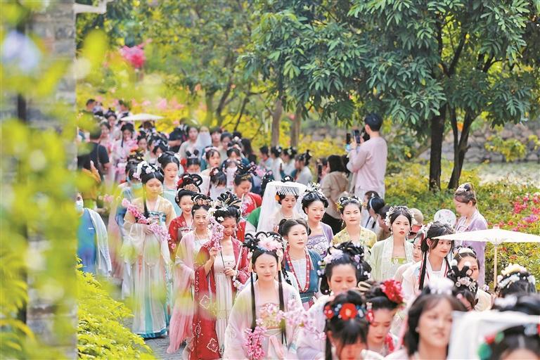 读特客户端·深圳新闻网2023年3月13日讯(深圳晚报记者 白雪)若待上林花似锦,出门俱是看花人。3月12日,一场别开生面的花朝节活动在深圳甘坑古镇上演,深港花神走秀、汉服方阵巡游、汉舞演绎、花朝市集等多元传统国风演绎环节为市民和游客带来了别致体验。盛开的簕杜鹃与风雅端庄的汉服交相辉映,绘出了一幅深圳三月春景图。