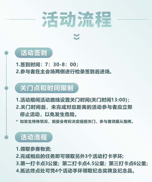 参与者在主会场物资领取处,领取参赛物资(含活动背包、活动手册及活动打卡手环),在沿途中经过3公里、4.5公里和6公里打卡点时,完成相应的任务即可领取另外3个活动打卡手环。最后抵达终点处可凭4个活动手环领取纪念奖牌及纪念品。