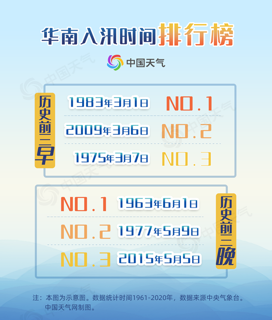 中国天气网大数据显示,1961年以来,广东大部分年份是带领华南入汛的“领头羊”。统计数据显示,华南前汛期开启时间最早是1983年的3月1日,最晚是1963年的6月1日。