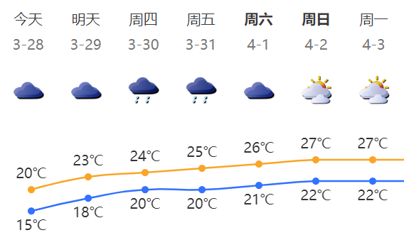 未来五天间中仍有阵雨,气温逐步回升。29日有分散小雨,早晚仍较清凉;30-31日有(雷)阵雨,部分时间雨势较大。4月1-3日多云为主,气温明显回升,天气暖湿有轻雾。