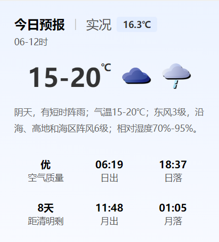 预计早晨6-9时,我市阴天,偶有零星小雨;气温15-17℃;偏东风2-3级;相对湿度80-100%;能见度普遍在5-15公里。