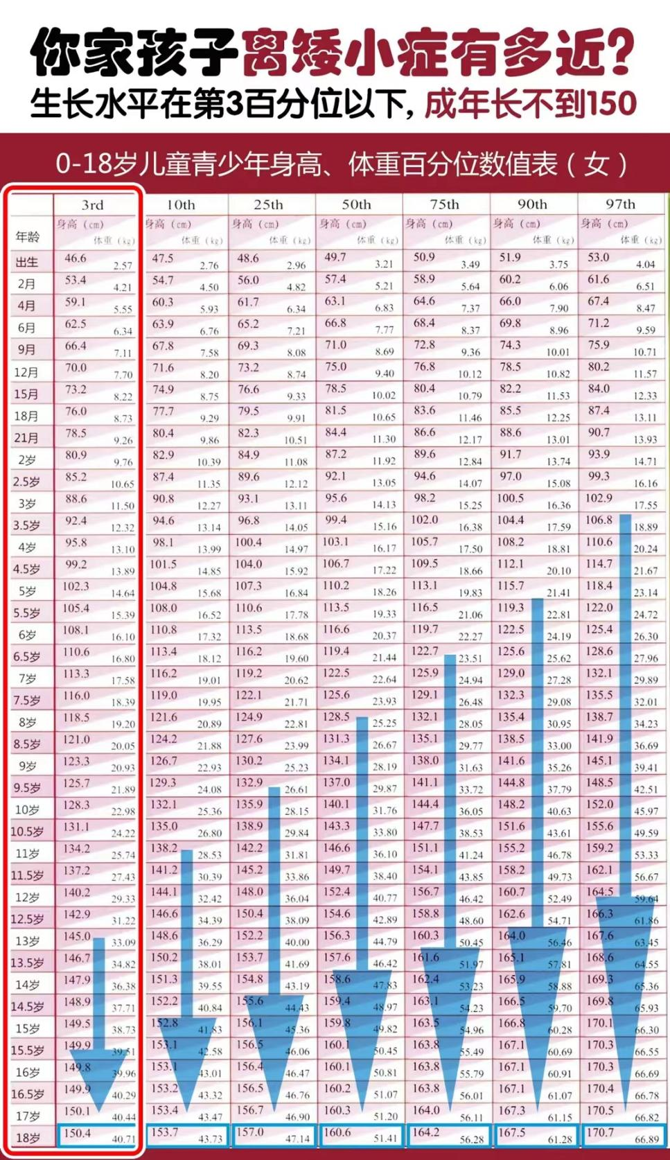 据了解,此次义诊对象为5至14岁出现以下症状的儿童:矮身材10th,身高落后、生长缓慢等儿童(详见下面身高对照表);孩子早发育,女孩7.5岁前乳房发育或者10岁前月经来潮;男孩9岁前开始睾丸、阴茎明显发育。