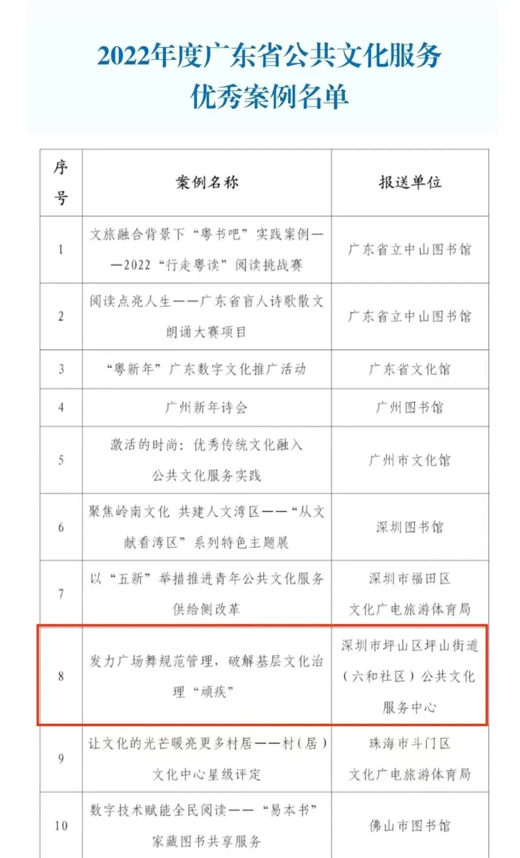 4月12日,广东省文化和旅游厅公示了关于2022年度广东省公共文化服务优秀案例、优秀短视频和优秀海报评选结果。在拟评定的广东省公共文化服务优秀案例中,深圳市坪山区坪山街道(六和社区)公共文化服务中心报送的“发力广场舞规范管理,破解基层文化治理‘顽疾’”案例成功入选。