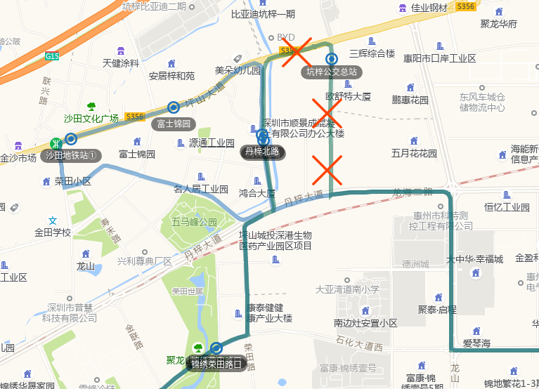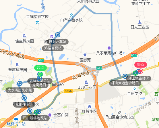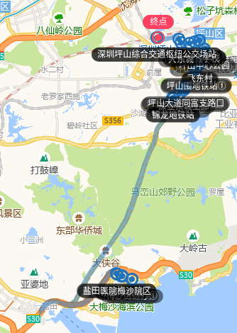 深圳坪山综合交通枢纽公交场站、大东城、坪山实验学校、坪山大剧院、坪山广场地铁站、飞东村、坪山围地铁站①、坪山大道同富支路口、深业东城上邸、锦龙地铁站、盐田医院梅沙院区、东部华侨城、梅沙街道办、梅沙街道办①、东部华侨城、盐田医院梅沙院区、锦龙地铁站、深业东城上邸、坪山大道同富支路口、坪山围地铁站①、飞东村、坪山中心公园、坪山大剧院、坪山实验学校、大东城、深圳坪山综合交通枢纽公交场站