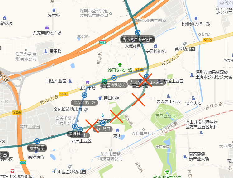 双方向增加“大水湾居民小组、龙田住宅区、坪山妇幼、坪山大道金沙路口”等4对公交停靠站。