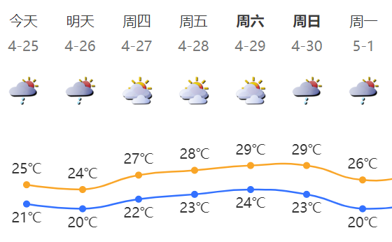 25日阴天间多云,有(雷)阵雨,气温21-25℃;26日阵雨转多云,天气清凉;27-29日多云,早晚有轻雾,天气趋于炎热;30日-5月1日有阵雨。近期天气仍不稳定,注意防御短时大风和局地强降水。