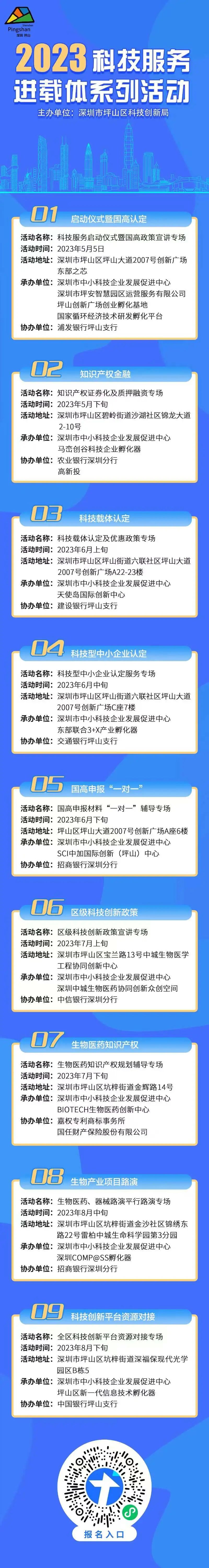 5月-8月,坪山区将举办2023年度科技服务进载体系列活动。该系列活动将举办9场,每场聚焦不同主题,包含国家高新技术企业认定、科技型中小企业认定、科技载体申报,科技金融赋能、知识产权服务、科技创新政策宣讲、全区科技创新平台资源对接等实用服务。通过创新打造科创“百宝箱”,借助各类“实用工具”助推企业高质量发展。