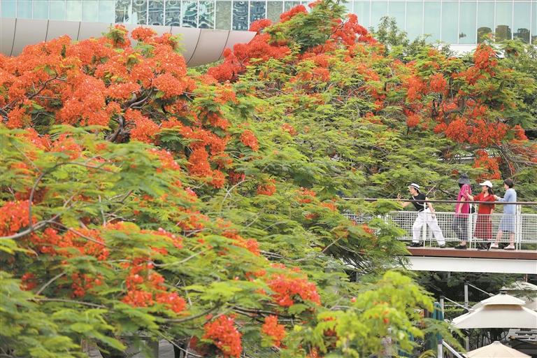 读特客户端·深圳新闻网2023年5月11日讯(深圳特区报记者 胡蕾)深圳华侨城生态广场,凤凰花盛开,市民游客纷纷打卡拍照。每年5月初夏,几场雨过后,深圳街头都会被火红的凤凰花点缀,像一只只火凤凰,栖息在翠绿的枝叶上。