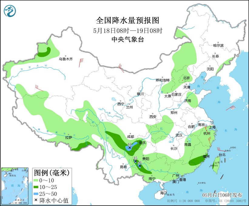 5月18日08时至19日08时,新疆伊犁河谷、内蒙古中部、华北北部、西藏中东部、西南地区东部、江南东部和南部、华南大部等地的部分地区有小到中雨,其中,四川南部、重庆西部、贵州西部、广西西部等地局地有大雨(25~45毫米)。新疆南疆盆地、内蒙古中西部、浙江等地的部分地区有4~6级风,其中,新疆东部部分地区有7级风;黄海南部海域、东海大部海域等海域将有6~7级、阵风8级的大风。