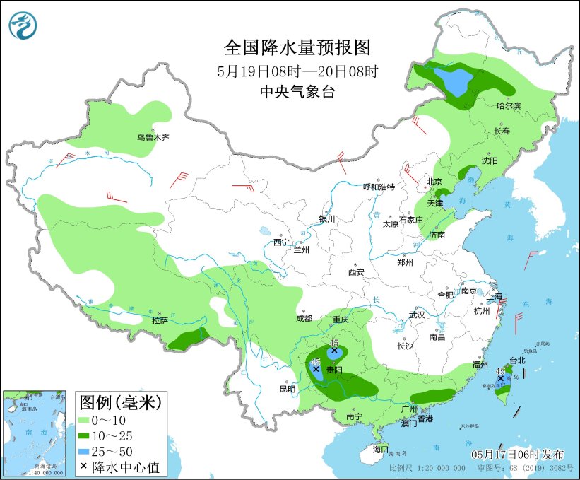 5月19日08时至20日08时,新疆南疆盆地和北部、内蒙古东部、东北地区大部、西藏大部、西南地区东部、江南南部、华南等地的部分地区有小到中雨,其中,内蒙古东部、贵州北部和西部等地局地有大雨(25~45毫米)。内蒙古中东部、新疆南部、甘肃河西、浙江东部等地部分地区有4~6级风,其中,新疆南疆盆地部分地区有7级风。
