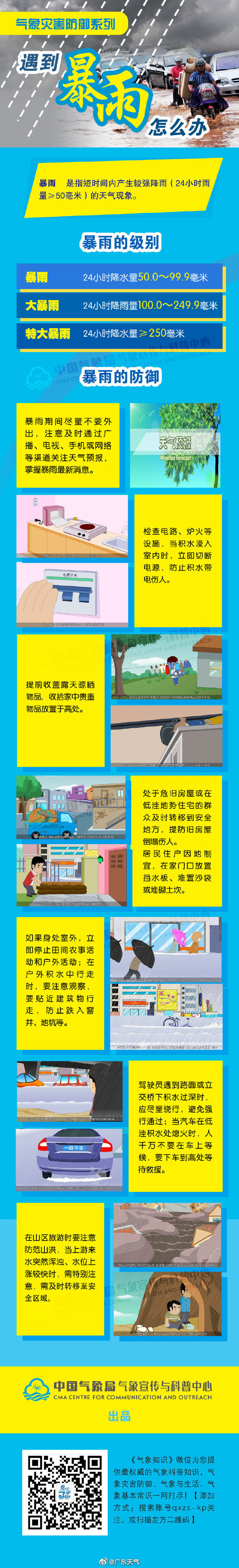 但不太好的是,强降雨将基本稳定在广东中南部一带,局地累计雨量可能会超过300毫米,并且会伴随激烈的短时强降雨。这一带人口较为密集、需要特别防范短时强降雨可能引发的城市内涝等次生灾害,出门上班、上学的小伙伴要格外注意安全。