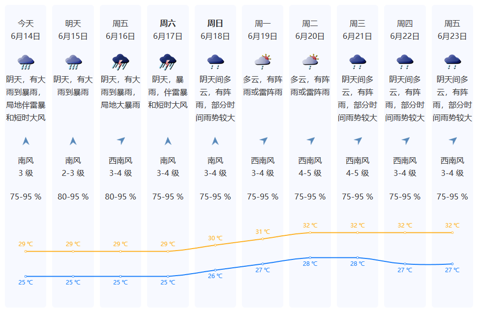 ■ 14-15日阴天,有大雨到暴雨局部大暴雨,雨时伴有雷暴和局地短时大风,气温26-30℃;