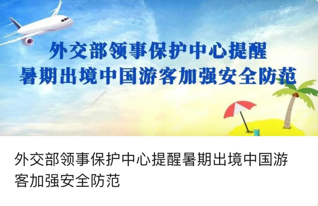 据外交部“领事直通车”微信公众号7月19日消息,暑期来临,不少中国公民计划利用假期赴境外旅游观光。当前,海外安全形势较为复杂严峻,各类安全风险因素交织叠加。外交部领事保护中心提醒暑期出境的中国游客注意安全,增强安全文明健康出行意识,开开心心旅游,平平安安回家。