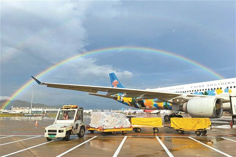 昨日,一阵急雨过后,深圳宝安国际机场上空出现了难得一见的“双彩虹”。“双彩虹”下,正值暑运高峰期的深圳机场格外忙碌,地面保障人员各司其职,保障航班安全运营。深圳特区报记者 刘羽洁 通讯员 陈戴维 摄