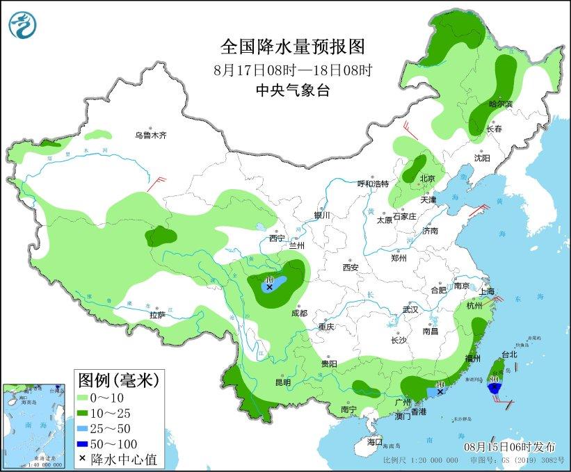图3 全国降水量预报图(8月17日08时-18日08时)