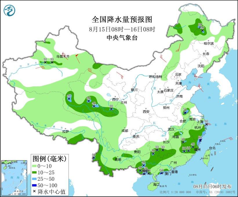 图1 全国降水量预报图(8月15日08时-16日08时)
