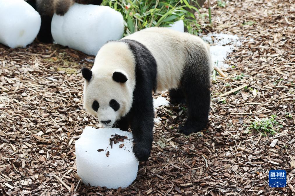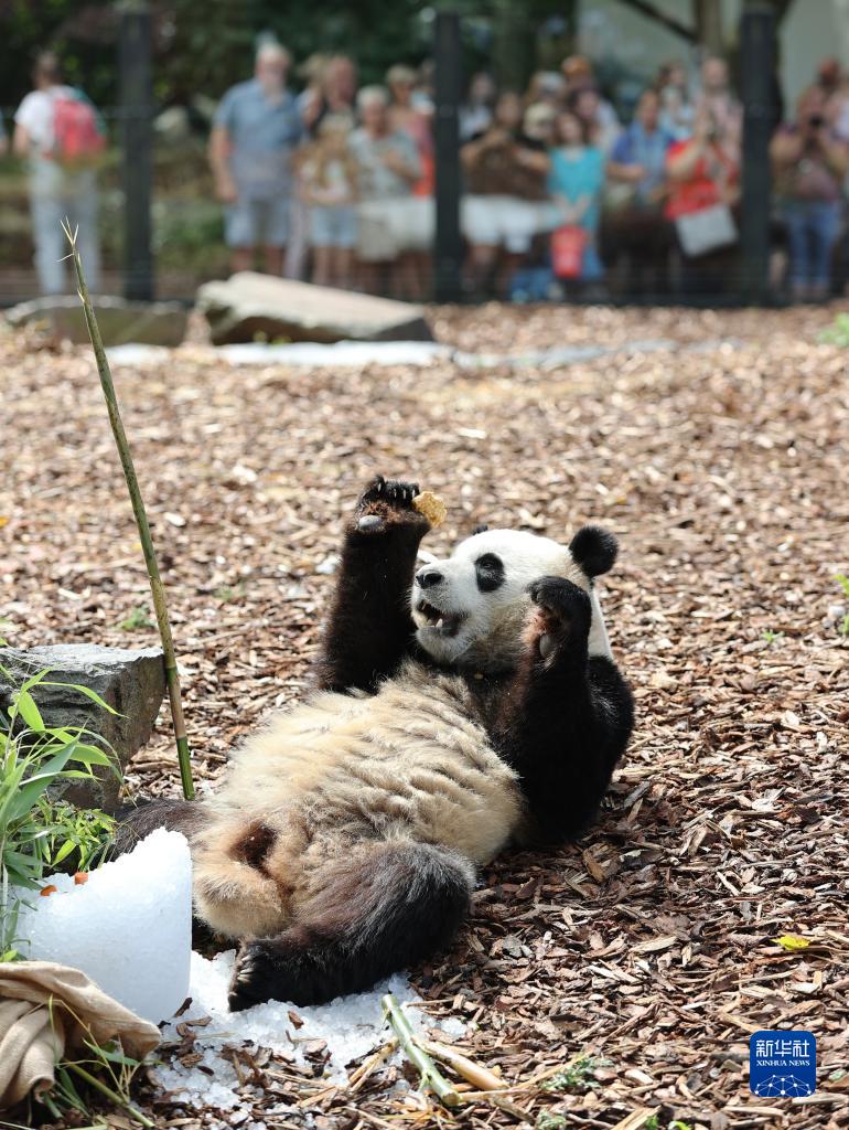 8月16日,在比利时布吕热莱特的天堂动物园,大熊猫“宝弟”享用“生日大餐”。新华社记者 赵丁喆 摄
