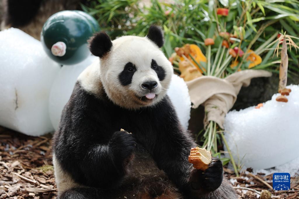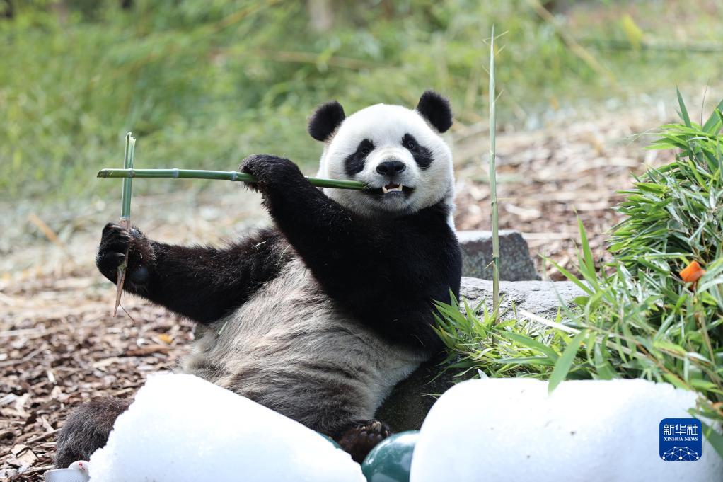 8月16日,在比利时布吕热莱特的天堂动物园,大熊猫“宝妹”享用“生日大餐”。新华社记者 赵丁喆 摄
