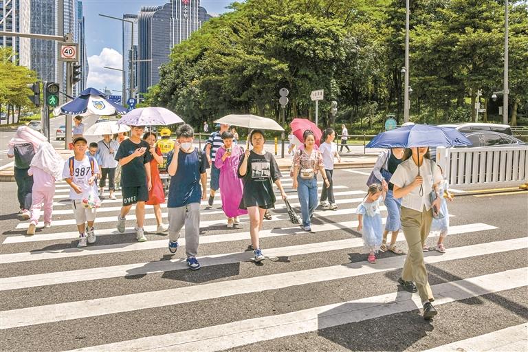 ▲近日,福田区彩田路,市民顶着烈日出行。 深圳晚报记者 严文婷 实习生 黄浩伦 摄