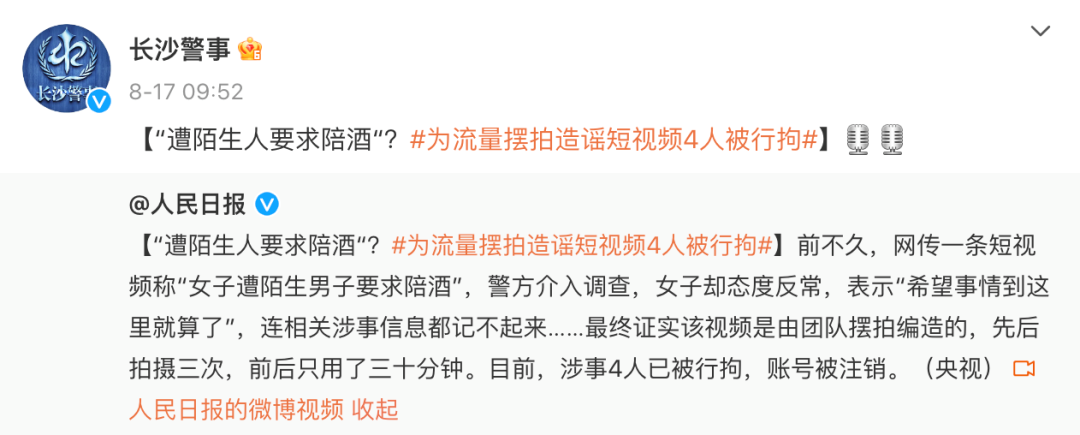 警方介入调查,最终证实该视频是由团队摆拍编造的,先后拍摄三次,前后只用了三十分钟。目前,涉事4人已被行拘,账号被注销。