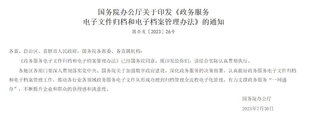 新华社北京8月22日电 日前,国务院办公厅印发《政务服务电子文件归档和电子档案管理办法》(以下简称《办法》),就进一步规范政务服务电子文件归档和电子档案管理,推动各行业各领域政务服务电子文件从形成办理到归档管理全流程电子化,从机制和流程上提出明确要求,便利企业和群众办事。