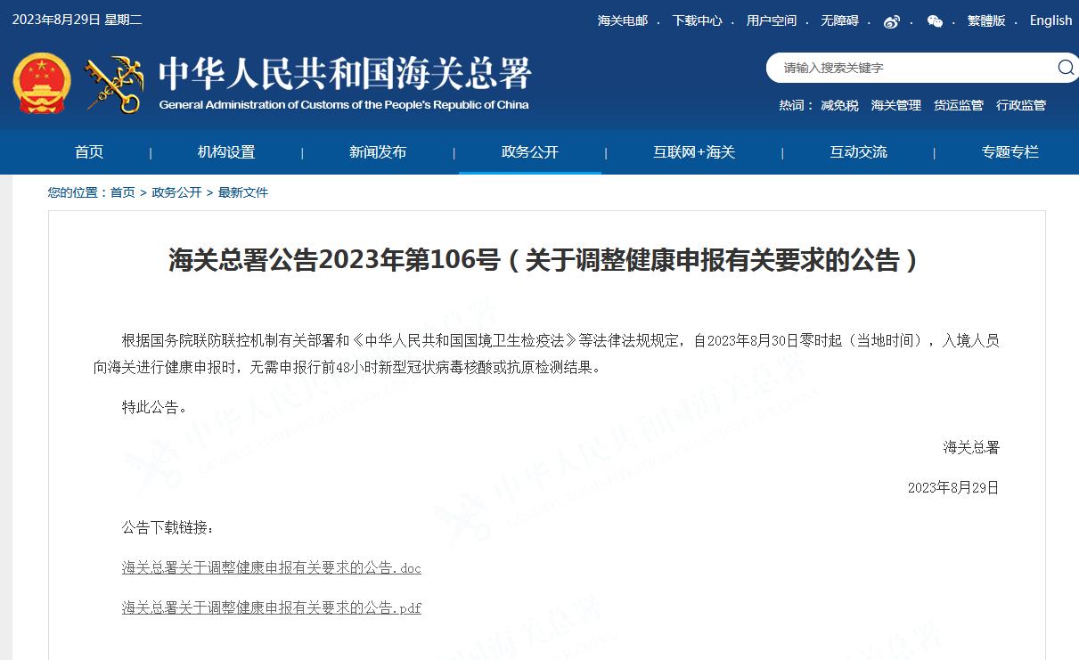 据海关总署网站29日消息,根据国务院联防联控机制有关部署和《中华人民共和国国境卫生检疫法》等法律法规规定,自2023年8月30日零时起(当地时间),入境人员向海关进行健康申报时,无需申报行前48小时新型冠状病毒核酸或抗原检测结果。