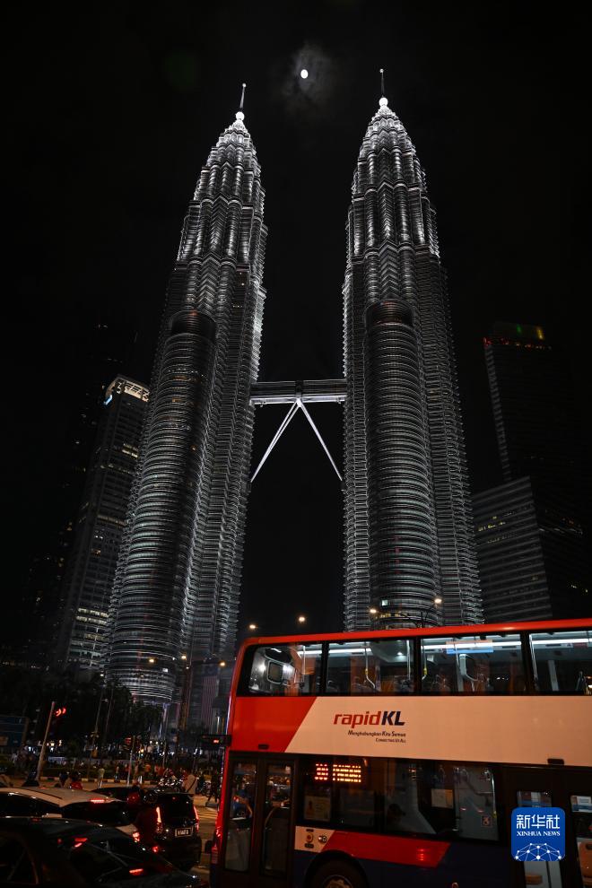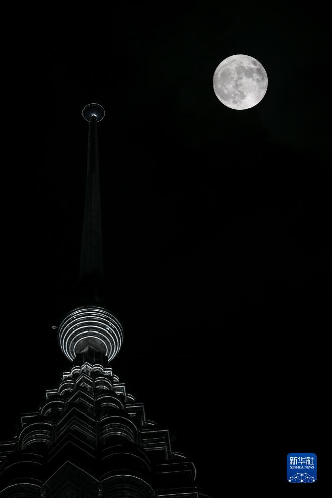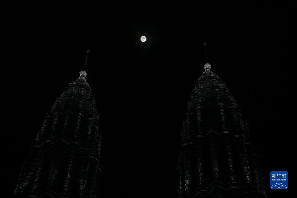 8月30日,“超级月亮”在马来西亚吉隆坡双子塔上空升起。新华社记者 程一恒 摄