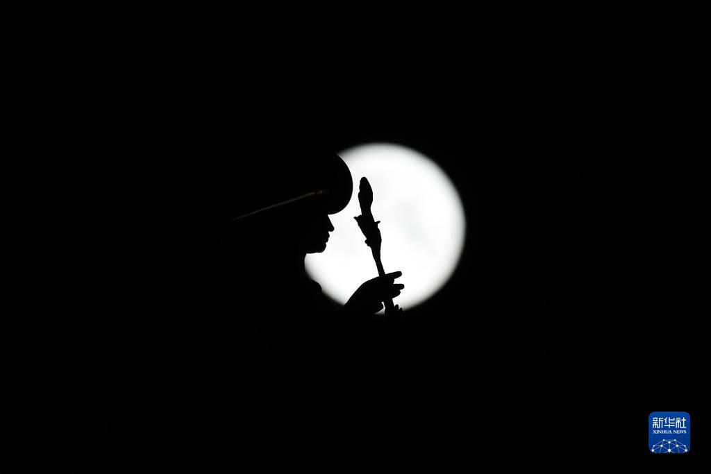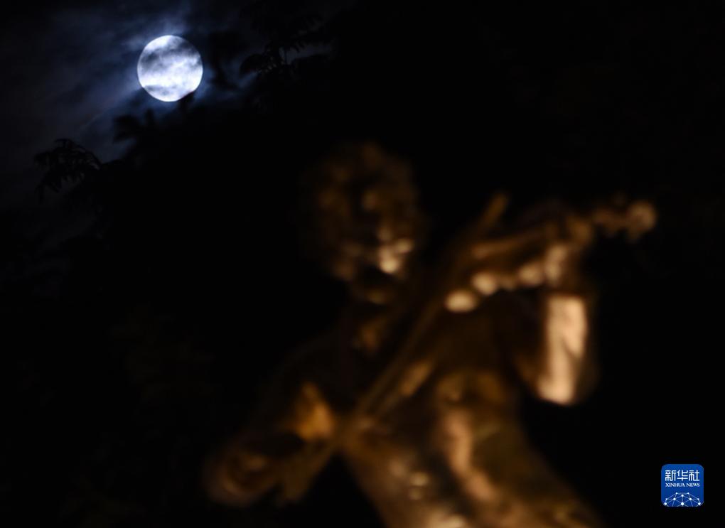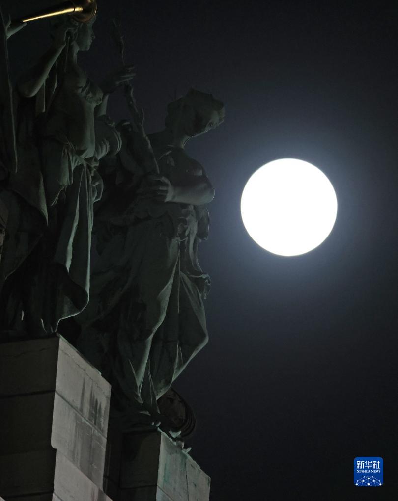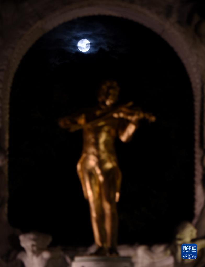 这是8月30日在奥地利维也纳城市公园内的施特劳斯雕像前拍摄的“超级月亮”。新华社记者 贺灿铃 摄