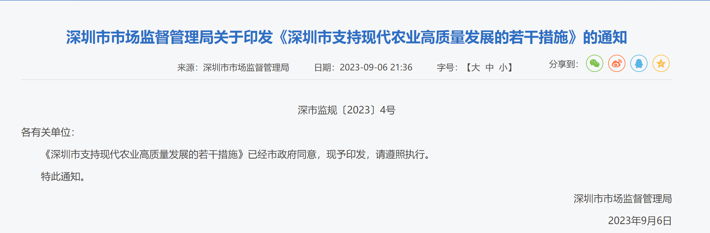 深圳新闻网2023年9月7日讯(深圳特区报记者 吴亚男)践行“大食物观、大农业观”,落实建设农业强国,深圳再出“实招”。9月6日晚,深圳市市场监督管理局官网发布《深圳市支持现代农业高质量发展的若干措施》(简称《若干措施》),从“科技链、产业链、民生供应链、质量监管链、资金链”五链融合方面,提出15条具体扶持举措,加快科技创新、促进产业融合、完善民生保障、强化质量管理、加大要素保障,推动深圳现代农业实现高质量发展。