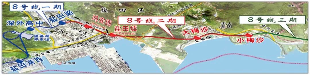 8号线二期工程自深圳地铁8号线一期工程终点站盐田路站末端接出,终至小梅沙站,是深圳第一条直达大小梅沙的地铁线。