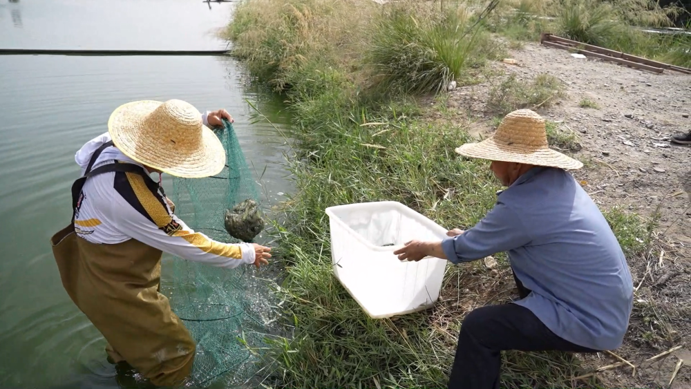 8月31日,新疆阿克苏市润泽农庄养殖基地,养殖户拿着网兜起虾。赵士杰 摄