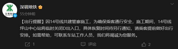 据深圳地铁消息,因14号线共建管廊施工,为确保乘客通行安全,施工期间,14号线坪山中心站将临时关闭D出入口,具体恢复时间待另行通知,请乘客提前做好出行安排。如需帮助,可联系车站工作人员。