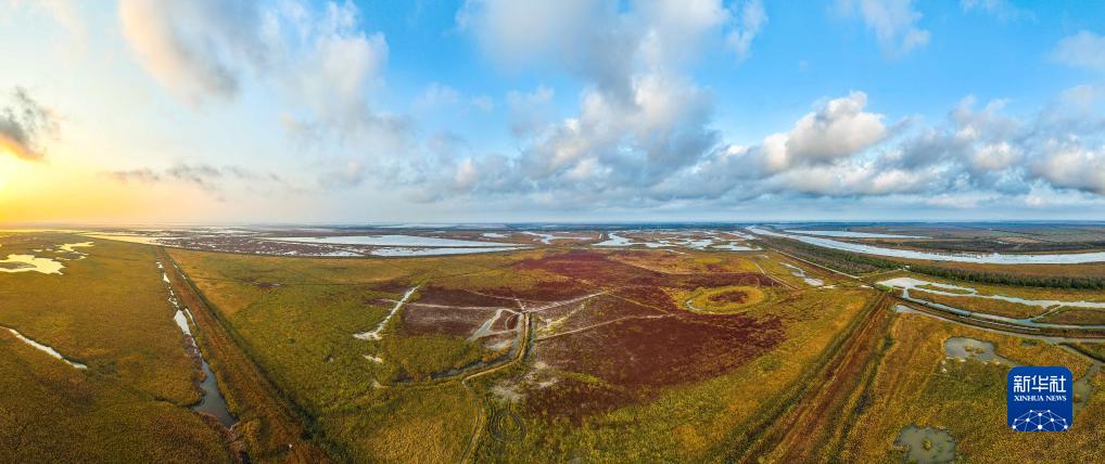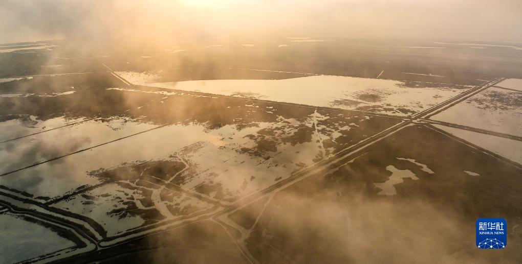 晨曦中的盐城湿地珍禽国家级自然保护区景色(2022年11月8日摄,无人机照片)。新华社记者 季春鹏 摄