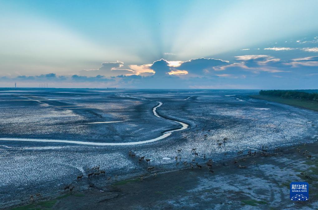 这是位于江苏盐城的大丰麋鹿国家级自然保护区晨景(2023年8月21日摄,无人机照片)。新华社记者 季春鹏 摄