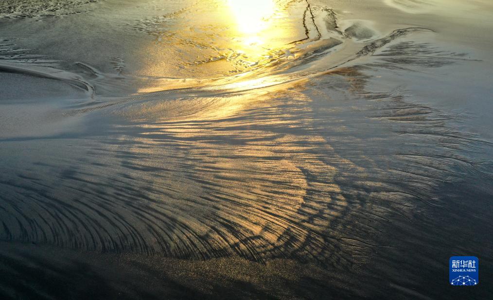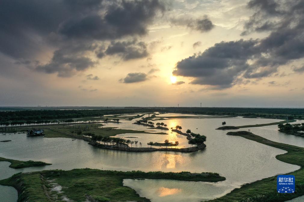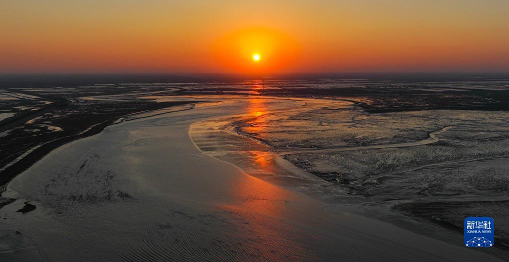 夕阳下盐城东台条子泥湿地景色(2023年9月1日摄,无人机照片)。新华社记者 杨磊 摄