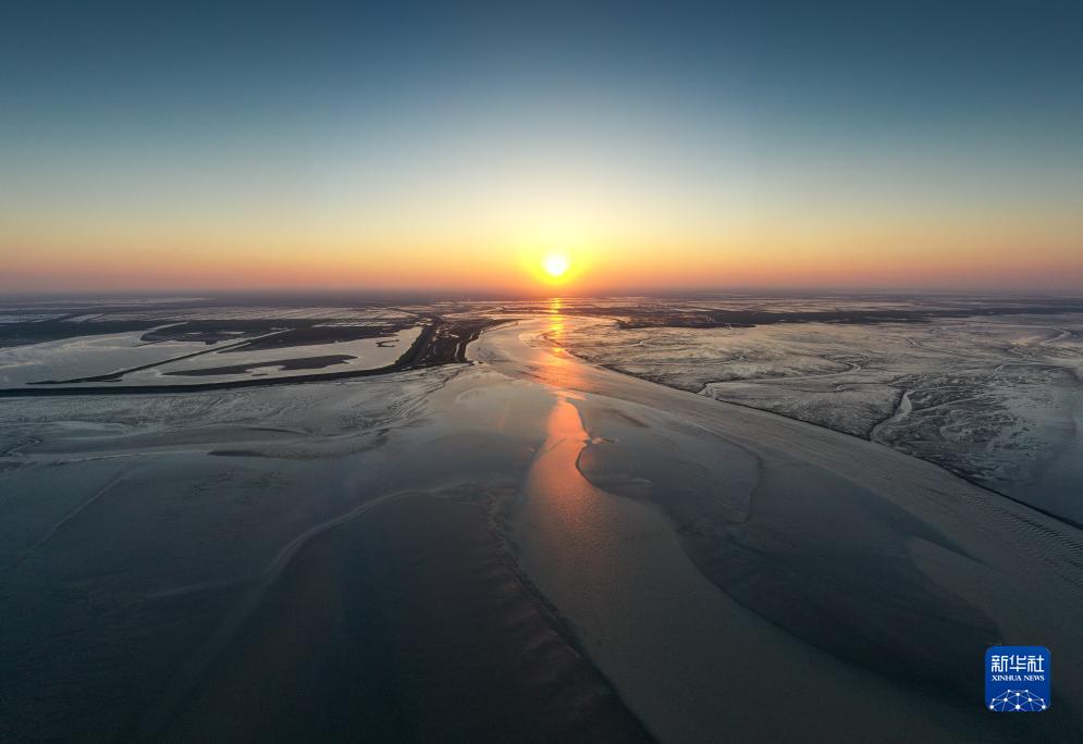 夕阳下盐城东台条子泥湿地景色(2023年9月1日摄,无人机照片)。新华社记者 杨磊 摄