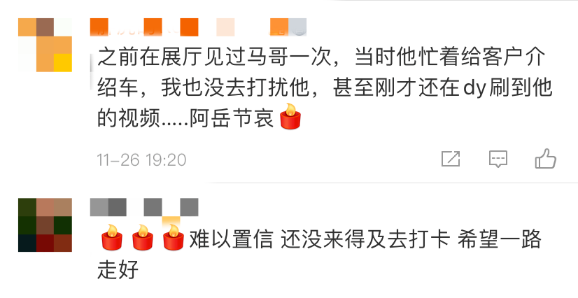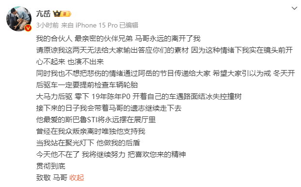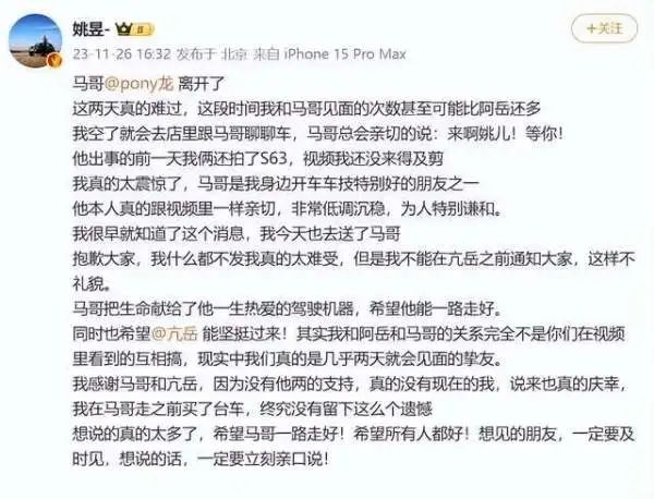 11月26日,汽车博主@亢岳微博发文,其合伙人马哥车祸离世。“我的合伙人,最亲密的伙伴兄弟马哥永远地离开了我。希望大家引以为戒,冬天开后驱车一定要提前检查车辆轮胎。”