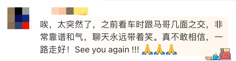 另一位汽车博主也证实了马哥的离世。“我真的太震惊了,马哥是我身边开车车技特别好的朋友之一。马哥把生命献给了他一生热爱的驾驶机器,希望他能一路走好。”