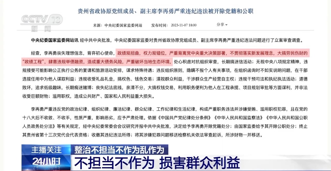 此外,个别党员干部也存在权力观异化、政绩观扭曲、事业观偏差等问题,影响恶劣。比如中央纪委国家监委在对贵州省政协原党组成员、副主席李再勇的双开通报中就指出,李再勇政绩观扭曲,权力观错位,严重背离党中央重大决策部署,不贯彻落实新发展理念,大搞劳民伤财的“政绩工程”,肆意违规举债融资,造成重大债务风险,严重破坏当地生态环境。
