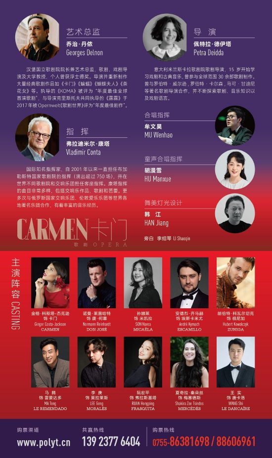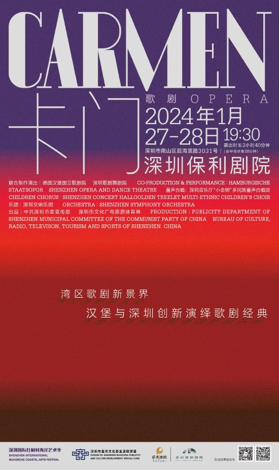 卡门的梦想被生活所捆绑着,而她灵魂中闪亮的爱情之光呼召着观众,在音乐中重生。2024年1月27日、28日,欢迎走进深圳保利剧院,一同感受这部“深圳版”《卡门》的无限魅力,敬请期待!